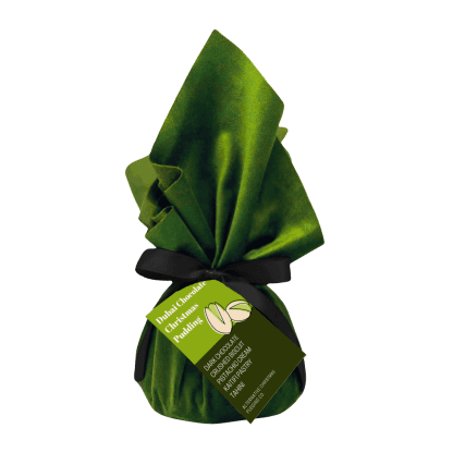 A rich dark chocolate and biscuit shell hides a luxurious filling of pistachio, crisp kataifi pastry strands, and silky tahini. Finished in deep green velvet and tied with a black satin ribbon. Serves 6